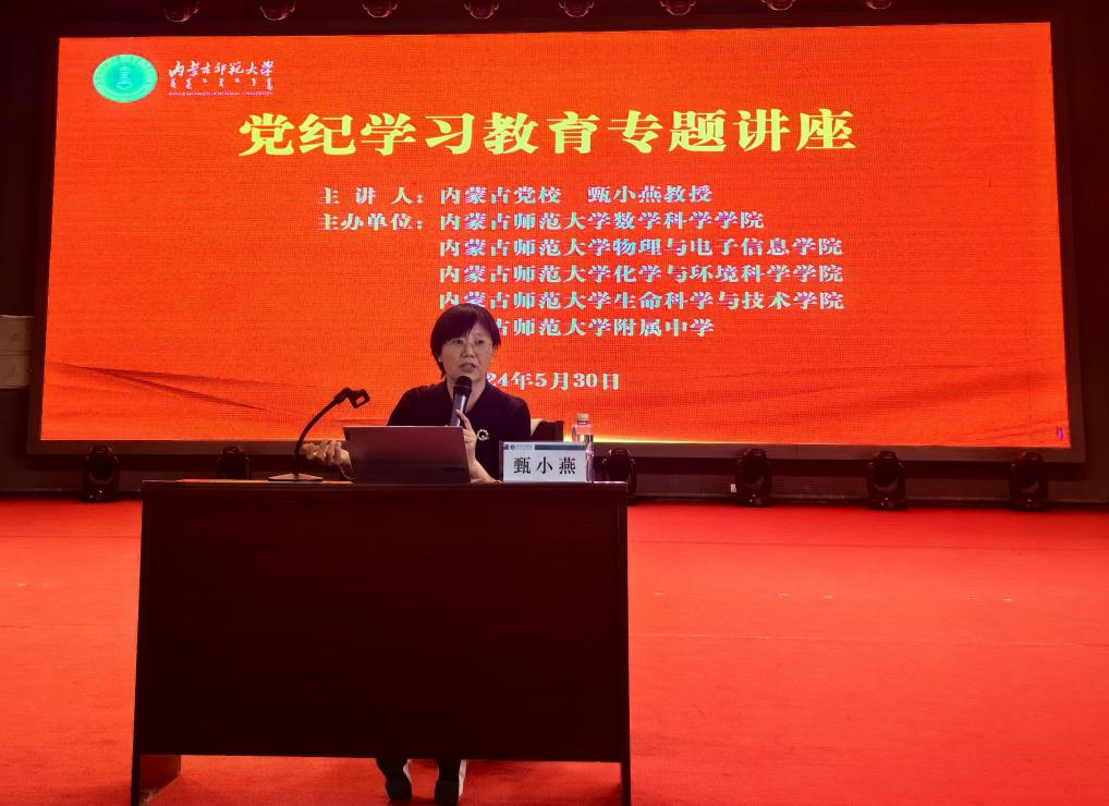 为深入学习贯彻习近平总书记关于全面加强党的纪律建设的重要论述和关于党纪学习教育的重要讲话重要指示精神,认真学习领会新修订的《中国共产党纪律处分条例》,进一步加强永利集团官网师生党员的党性修养与政治素质,5月30日下午,永利集团官网联合物理与电子信息学院、化学与环境科学学院、生命科学与技术学院和附属中学在附属中学共同举办了党纪学习教育专题讲座。讲座特邀内蒙古党校党史党建教研部甄小燕教授作题为“深入学习贯彻《中国共产党纪律处分条例》”的专题辅导报告,学院全体教工党员和部分学生党员参加学习。