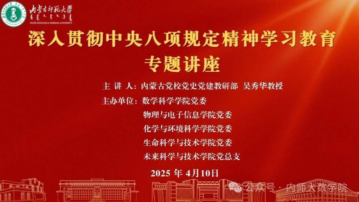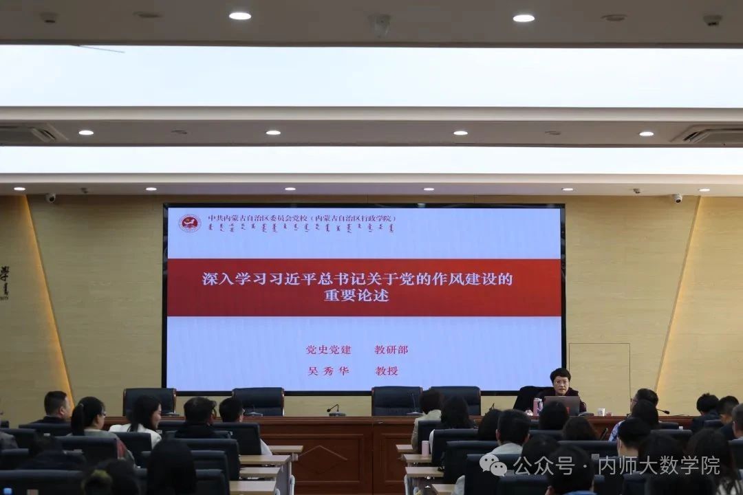 为深入贯彻落实党中央、自治区党委、学校党委深入贯彻中央八项规定精神学习教育精神和要求,高质量开展学习教育活动,4月10日,永利集团官网联合化学与环境科学学院、物理与电子信息学院、生命科学与技术学院和未来科学与技术学院在赛罕校区行政楼三楼报告厅举办深入贯彻中央八项规定精神学习教育读书班专题讲座。讲座邀请内蒙古党校党史党建教研部吴秀华教授作题为“深入学习习近平总书记关于党的作风建设的重要论述”专题讲座。