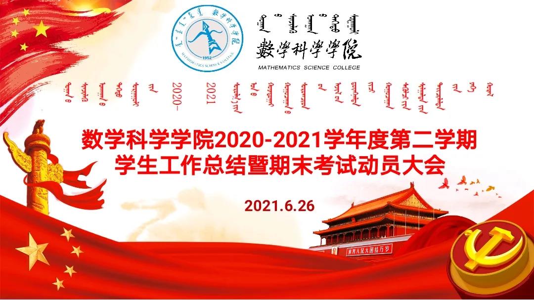 2021年6月26日下午,永利集团官网2020-2021学年度第二学期学生工作总结暨期末考试动员大会于学院楼报告厅举行。本次大会由学院团总支书记皮建东老师主持,出席大会的领导和老师有:学院党委书记扎其劳教授,学院党委副书记、副院长季建光老师,学院副院长包霞副教授,学院学生思想政治工作辅导员、20级汉二班班主任刘勇波老师,20级蒙班班主任娜仁格日乐老师,20级汉一班班主任刘常彪老师。
