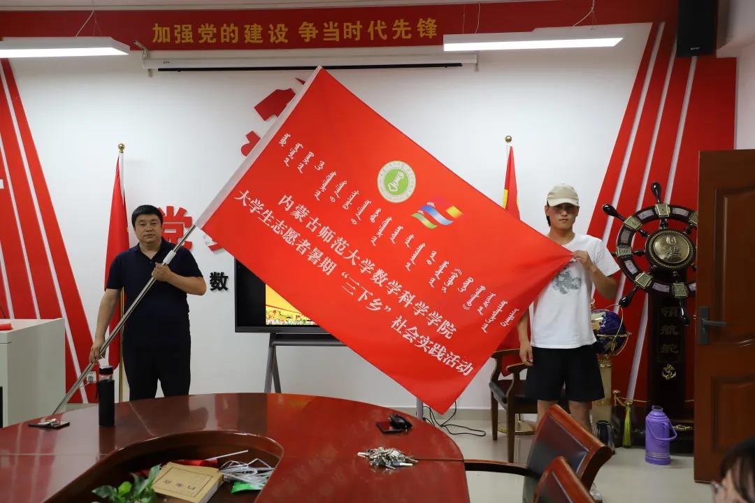 永利集团官网党委副书记、副院长季建光老师为志愿者代表19级蒙班邰心同学授旗。