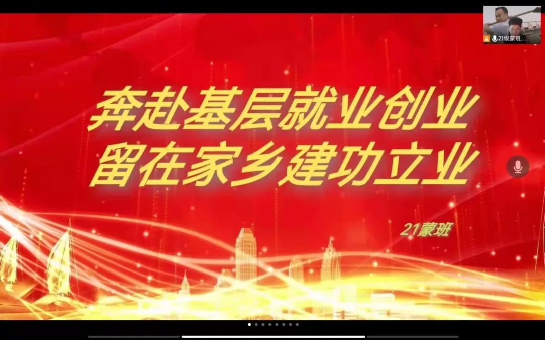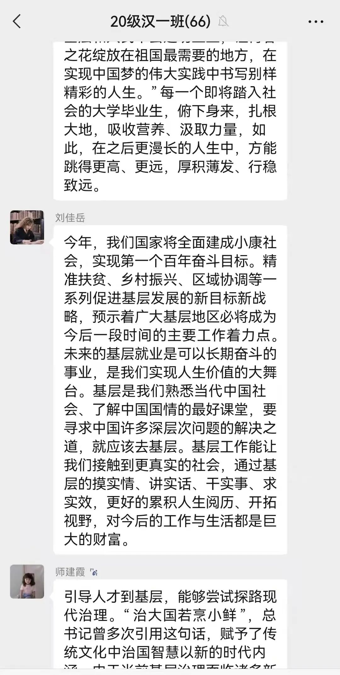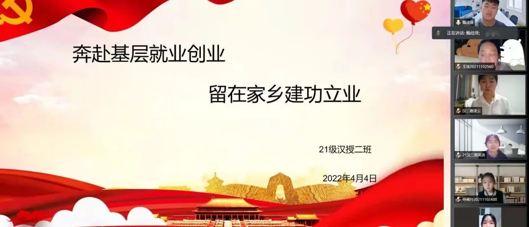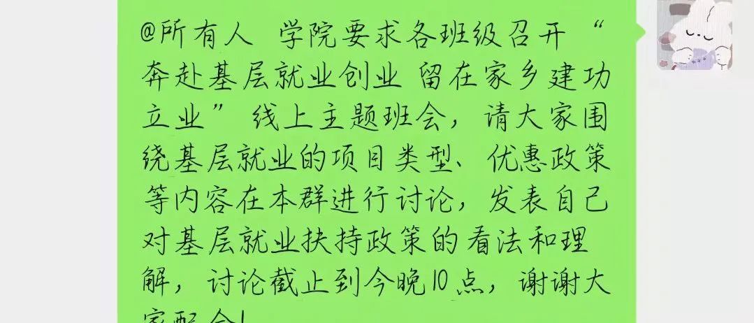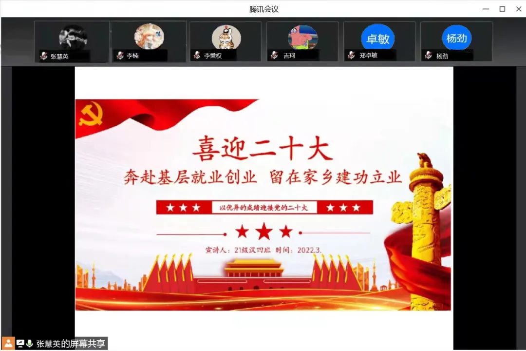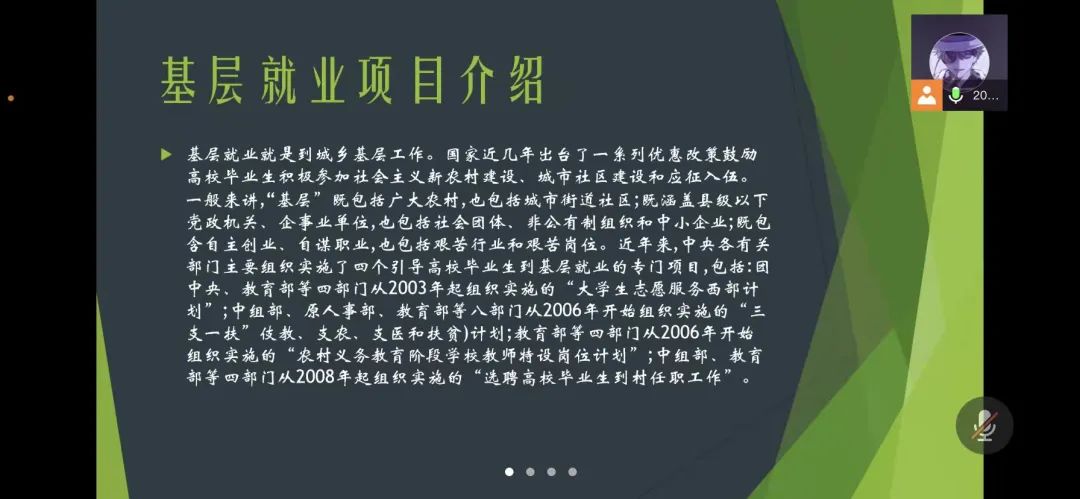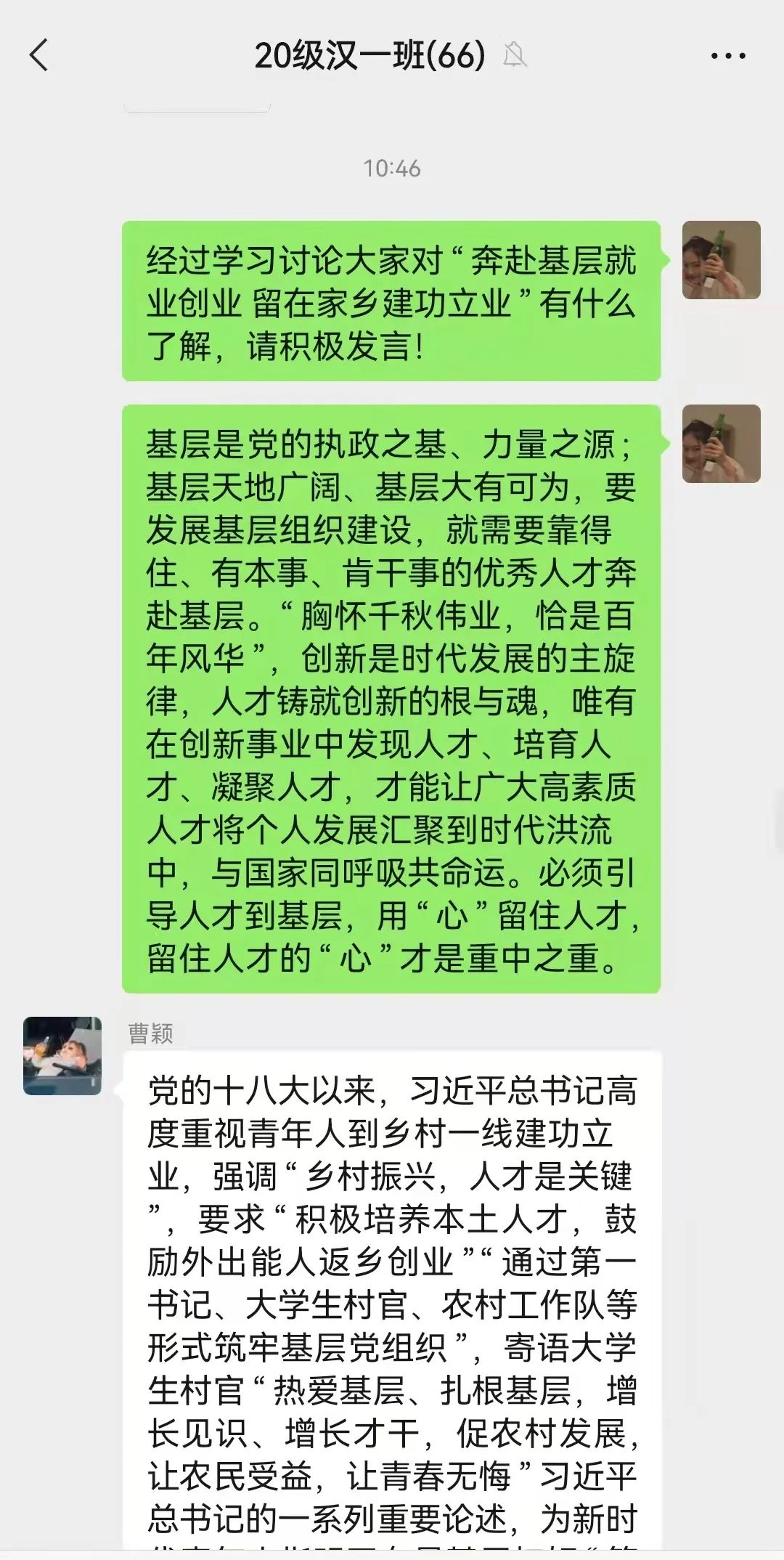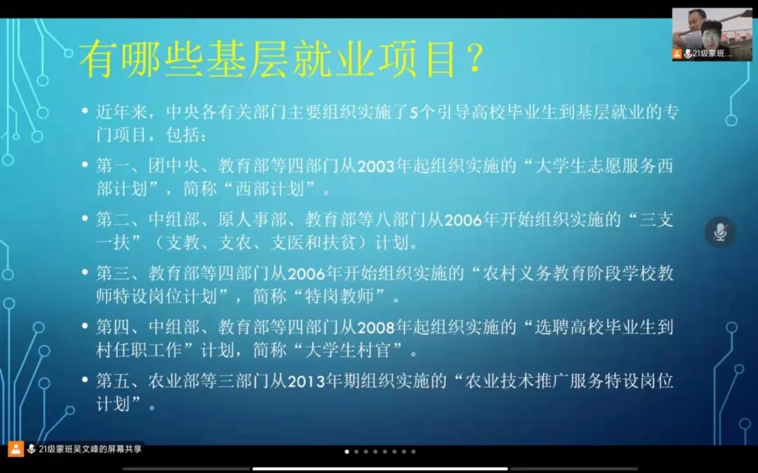 国家近几年出台了一系列优惠政策鼓励高校毕业生积极参加社会主义新农村建设、城市社区建设。为进一步让同学们了解基层就业,yl23411永利集团官网各班级开展“奔赴基层就业创业,留在家乡建功立业”线上主题班会,针对基层就业的项目类型,优惠政策等内容进行学习,在充分理解基层就业扶持政策的基础上引导各班同学们加入基层就业。