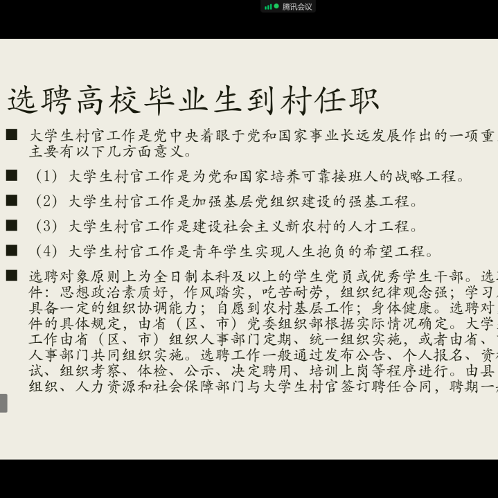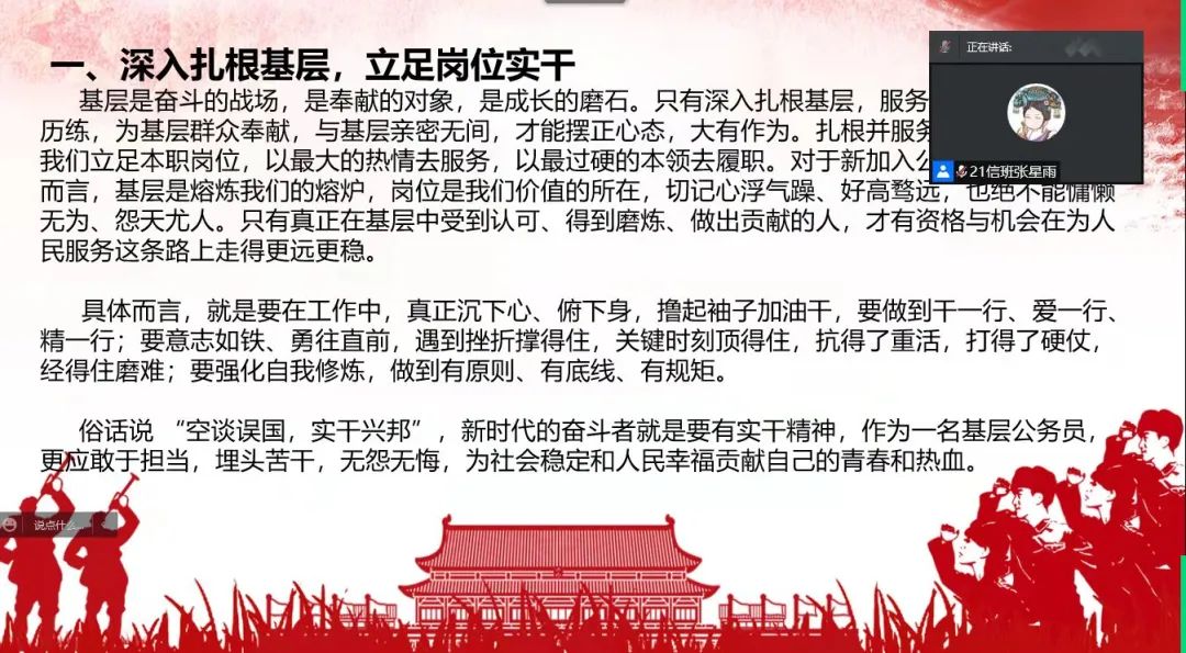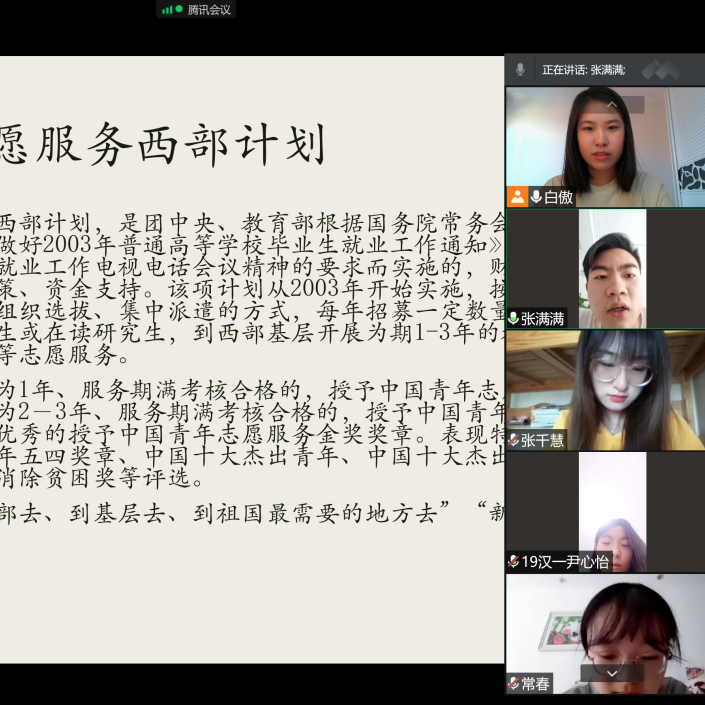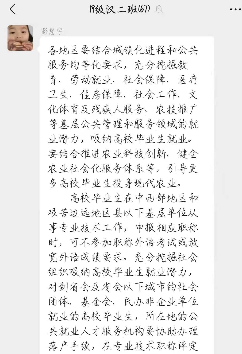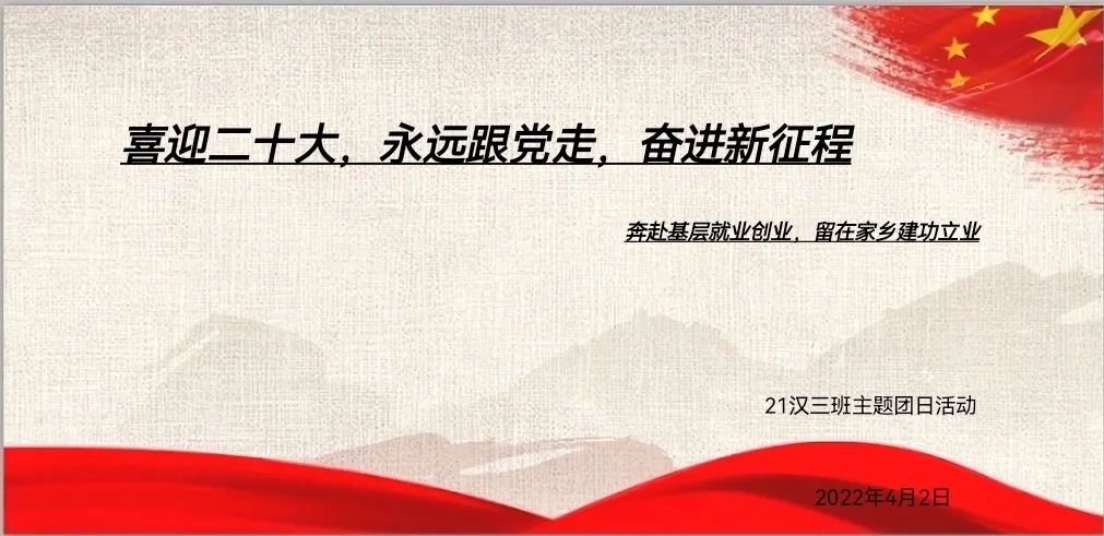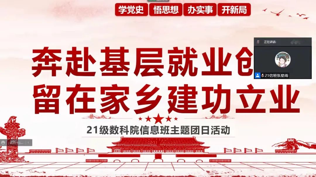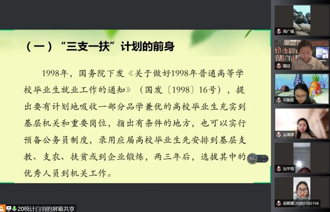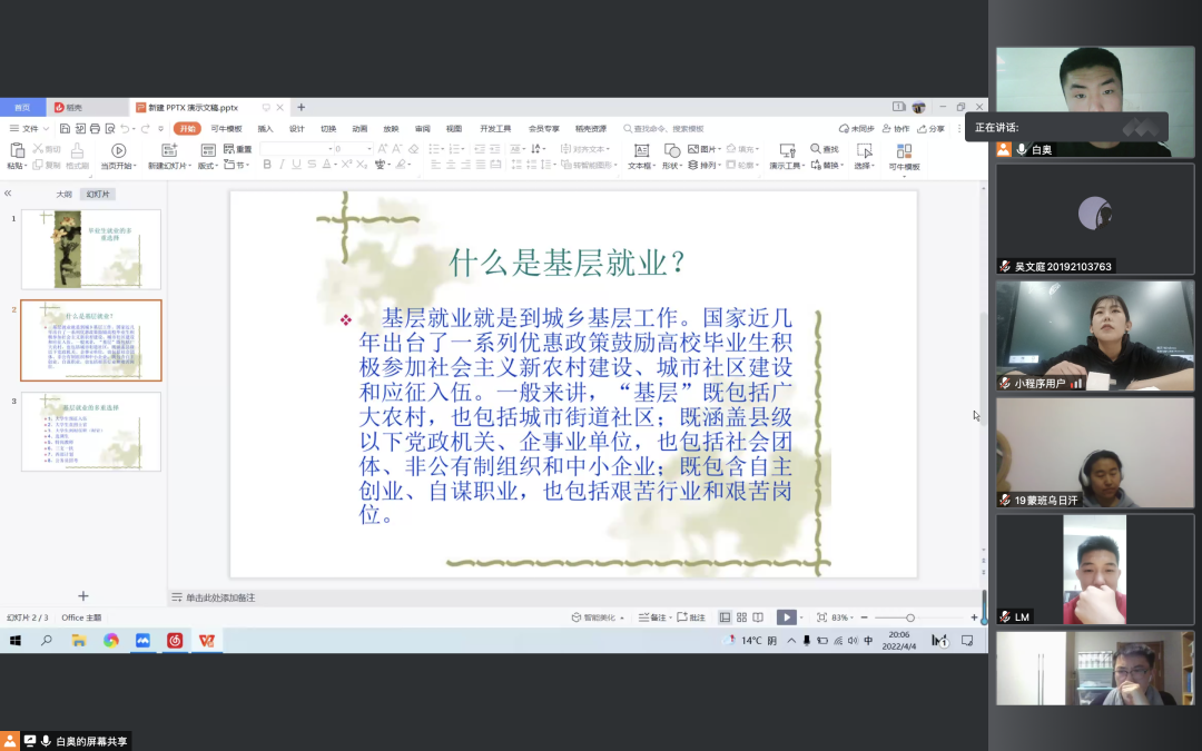 国家近几年出台了一系列优惠政策鼓励高校毕业生积极参加社会主义新农村建设、城市社区建设。为进一步让同学们了解基层就业,yl23411永利集团官网各班级开展“奔赴基层就业创业,留在家乡建功立业”线上主题班会,针对基层就业的项目类型,优惠政策等内容进行学习,在充分理解基层就业扶持政策的基础上引导各班同学们加入基层就业。