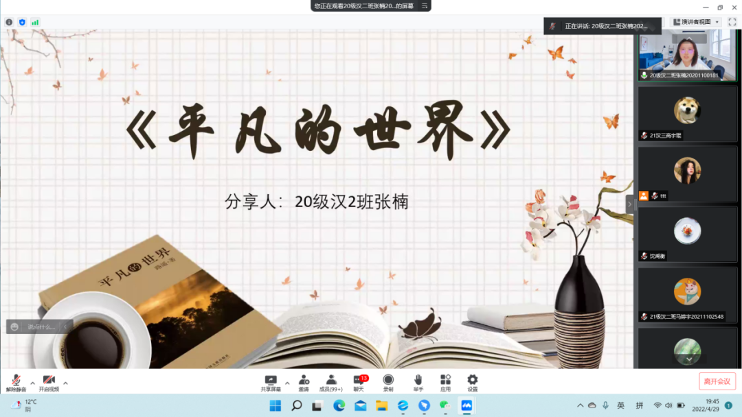 第四位进行分享的同学是20级汉二班的张楠同学。曾获2020-2021学年度自治区奖学金。分享的书籍为《平凡的世界》。