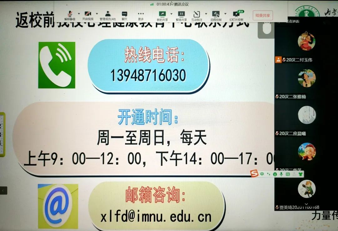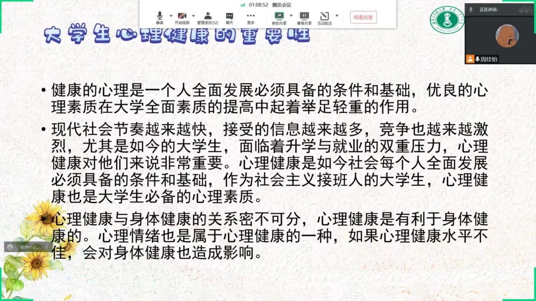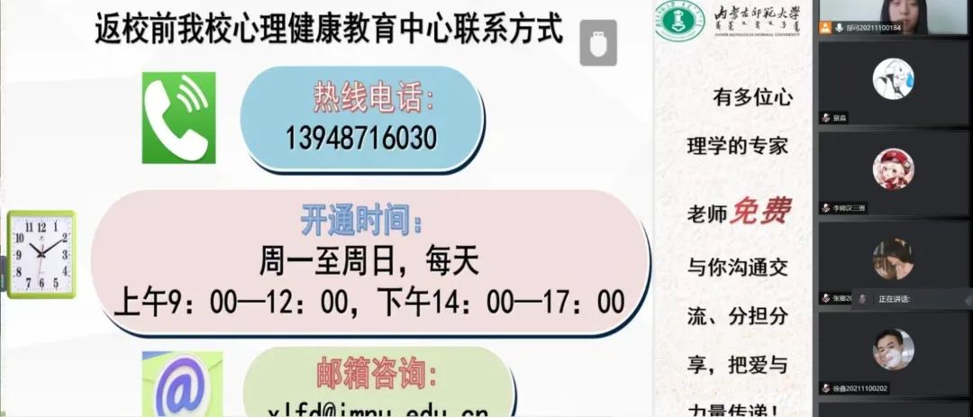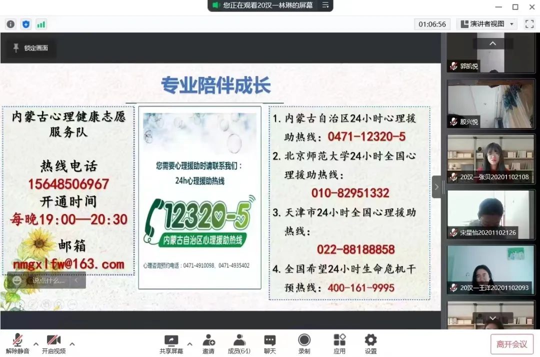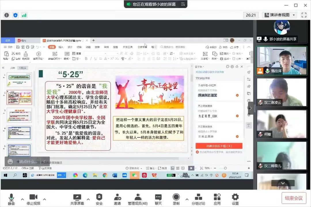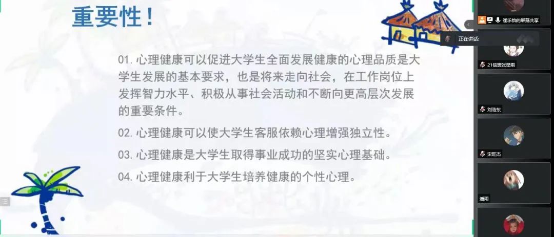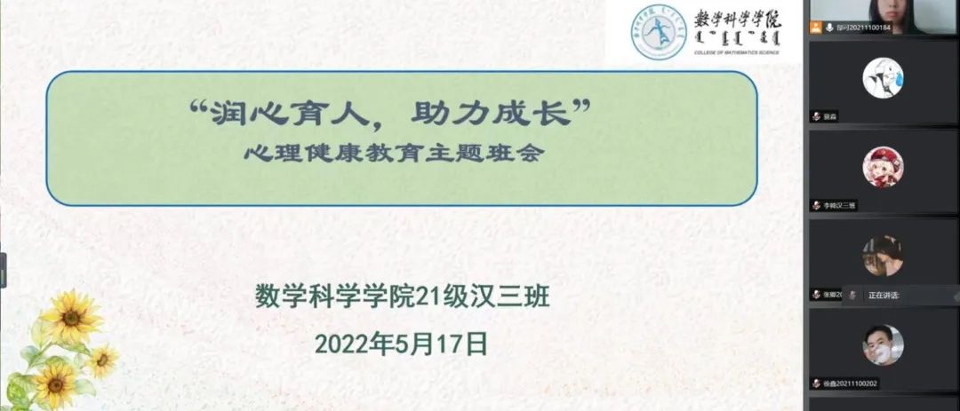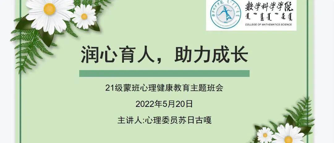 为深入推动大学生心理健康教育,在大学生群体中普及心理健康知识,引导大学生积极主动地关注自身心理健康,促进大学生健康全面发展,永利集团官网于5月16日—5月24日召开“润心育人,助力成长”心理健康主题班会,向同学们介绍5.25大学生心理健康日的由来、大学生心理健康的重要性、学校心理健康教育的服务机构以及服务内容、介绍心理健康的重要性等,保障同学们能够度过一个愉快的大学生活。