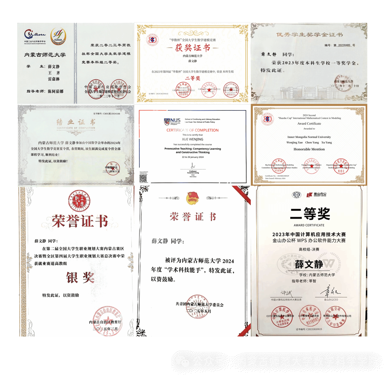 薛文静同学在校期间品学兼优,以交换生身份在北京“双一流”院校首都师范大学交流学习一年,并入选“卓越师范生拔尖培养计划”,以国家公派短期留学生身份到新加坡国立大学(NUS)学习。先后荣获2023年"高教社杯"全国大学生数学建模竞赛全国二等奖、2024年"华数杯"国际赛H奖(国际二等奖)、2024年全国大学生数学竞赛省级一等奖。她还利用课余时间积极参加校内外实践活动,担任大学生支教志愿者,与中小学生共同完成了“一起云课堂”等活动,赴和林格尔百什户学校支教,去首都师范大学附属回龙观育新学校进行教育实习。此外还先后担任yl23411永利集团官网辩论社辩手,yl23411永利集团官网学工助理等工作。