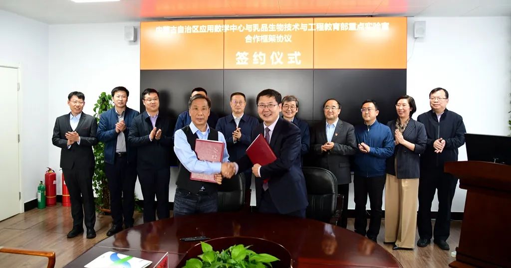 张和平与扎其劳分别代表乳品生物技术与工程教育部重点实验室和内蒙古自治区应用数学中心签署了合作框架协议。