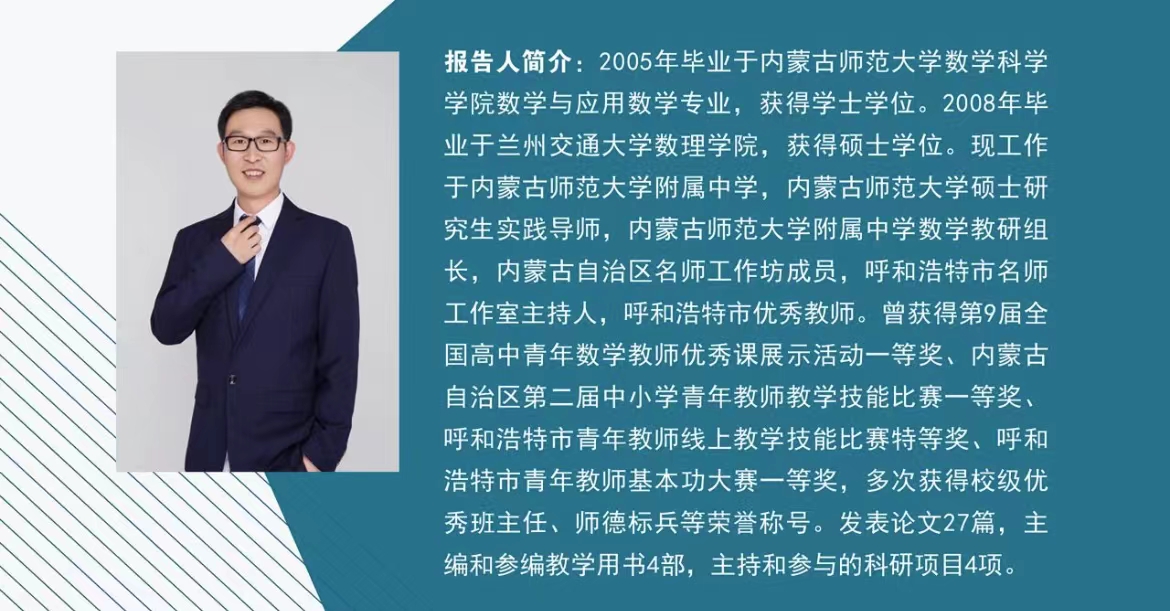 在yl23411永利集团官网70周年校庆的热烈气氛下,为进一步提升永利集团官网本科生、研究生教学能力,开拓师范生备课的眼界,以优促优,鼓励永利集团官网在校生向优秀校友学习请教,由内蒙古自治区应用数学中心联合yl23411永利集团官网举办的系列讲座——“用艺术的眼光备课”于2022年5月31日(星期二)19:30—22:00在线上开展。