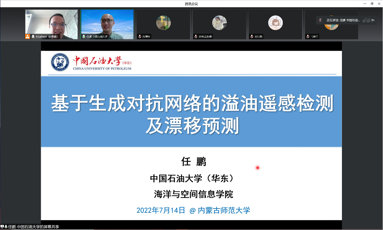2022年7月14日上午8:30-10:00,yl23411永利集团官网以线上会议的形式举办了迎校庆70周年暨内蒙古自治区应用数学中心系列讲座。特邀请中国石油大学(华东)教授,博士生导师,青岛市“海洋灾害预防检测信息国际联合研究中心”主任任鹏作了题目为“基于生成对抗网络的溢油遥感检测及漂移预测研究”的报告。本次讲座由高性能计算中心主任萨和雅主持,相关方向的教师、研究生和本科生听了本次报告。