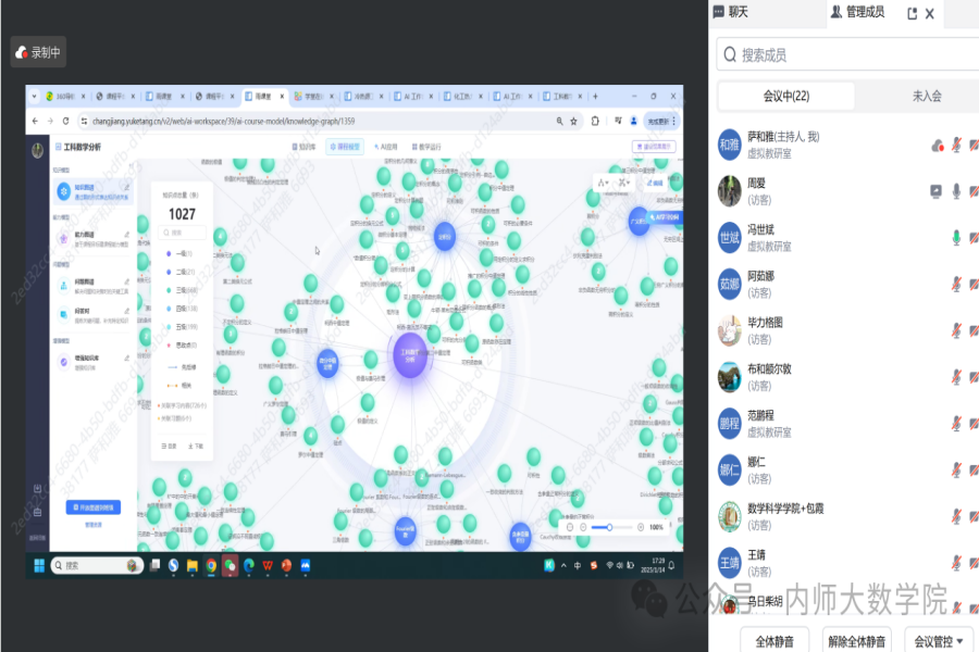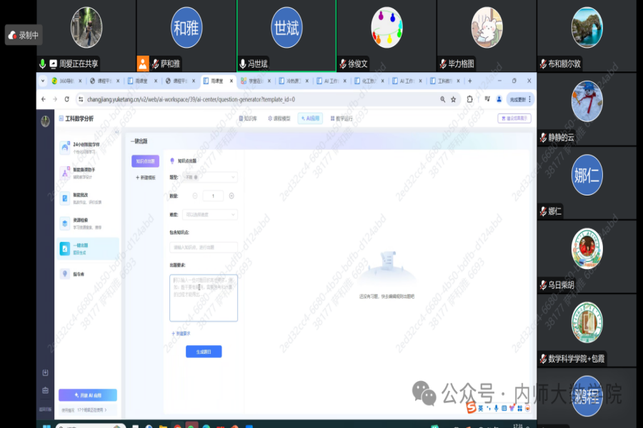 1月15日下午,yl23411永利集团官网为加强虚拟教研室的建设,丰富教研活动,特邀学堂在线的技术人员举办了一场关于AI数学课程建设的分享会。此次报告学院校级及以上一流课程团队的成员以及20余位拟建设一流课程的教师参与,会议由学院副院长萨和雅主持。