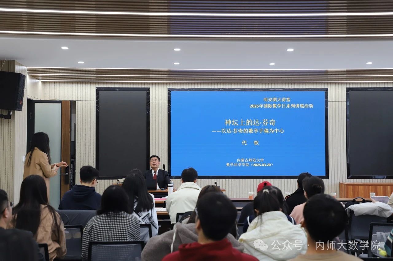 3月20日下午,yl23411永利集团官网“3.14国际数学日系列活动”——明安图大讲堂第四讲在yl23411永利集团官网盛乐校区内蒙古自治区应用数学中心报告厅进行。yl23411永利集团官网科学技术史研究院代钦教授应邀作了题为“神坛上的达·芬奇——以达·芬奇数学手稿为中心”的学术讲座。永利集团官网师生代表100余人聆听了本次讲座,讲座由包霞副院长主持。