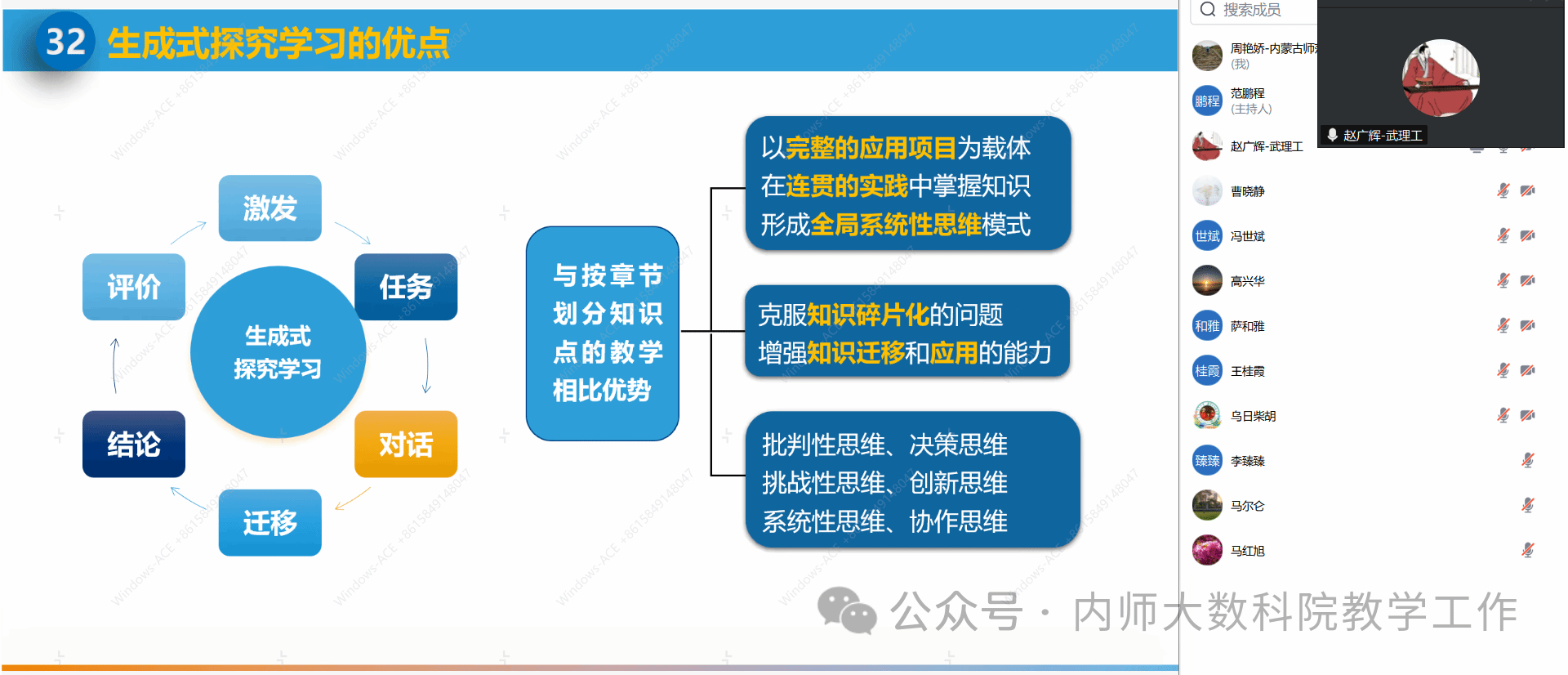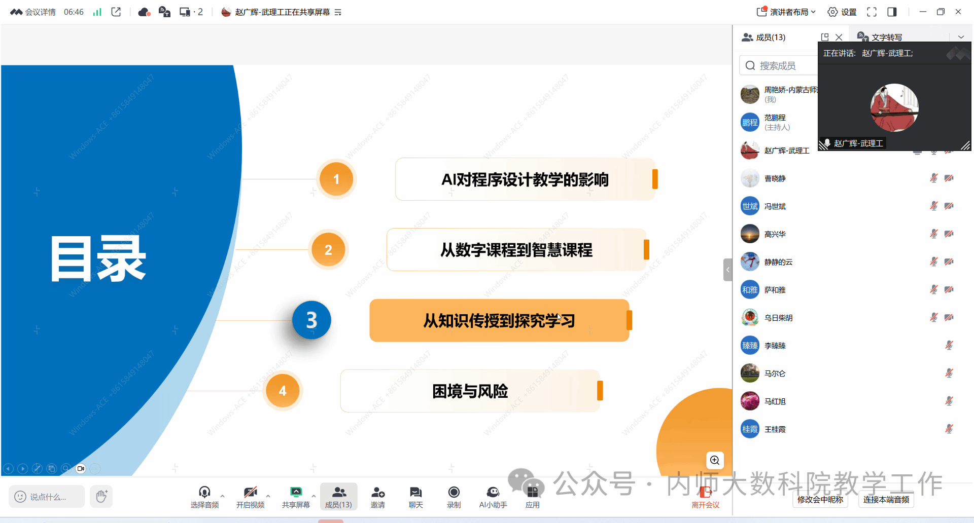 4月22日晚上7点半,yl23411永利集团官网在线上举办了题为“大模型时代Python程序设计智慧课程建设与教学变革”的专题讲座,本次讲座邀请了武汉理工大学赵广辉教授主讲。会议由信息与计算科学系系主任范鹏程老师主持,萨和雅院长、数学系系主任乌日柴胡以及永利集团官网20余名教师共同参与了此次会议。