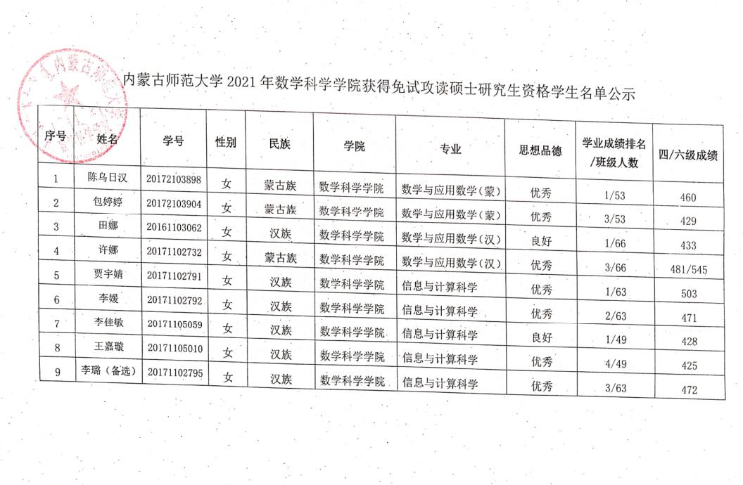 为保障推荐优秀应届本科毕业生免试攻读硕士学位研究生(以下简称推免生)工作的顺利发展,促进本科教学质量的提高,根据《yl23411永利集团官网推荐优秀应届本科毕业生免试攻读硕士学位研究生工作实施办法》文件精神,结合学院实际,通过yl23411永利集团官网2021年优秀应届本科毕业生推荐免试攻读硕士学位领导小组工作(以下简称推免工作)会议,评选出了获得2021年yl23411永利集团官网推荐免试攻读硕士研究生资格的学生及预备推荐免试攻读硕士研究生资格学生名单。现对推免工作领导小组成员、获得2021年yl23411永利集团官网获得推荐免试攻读硕士研究生资格学生(预备推荐学生)名单进行公示,具体内容请见附件!